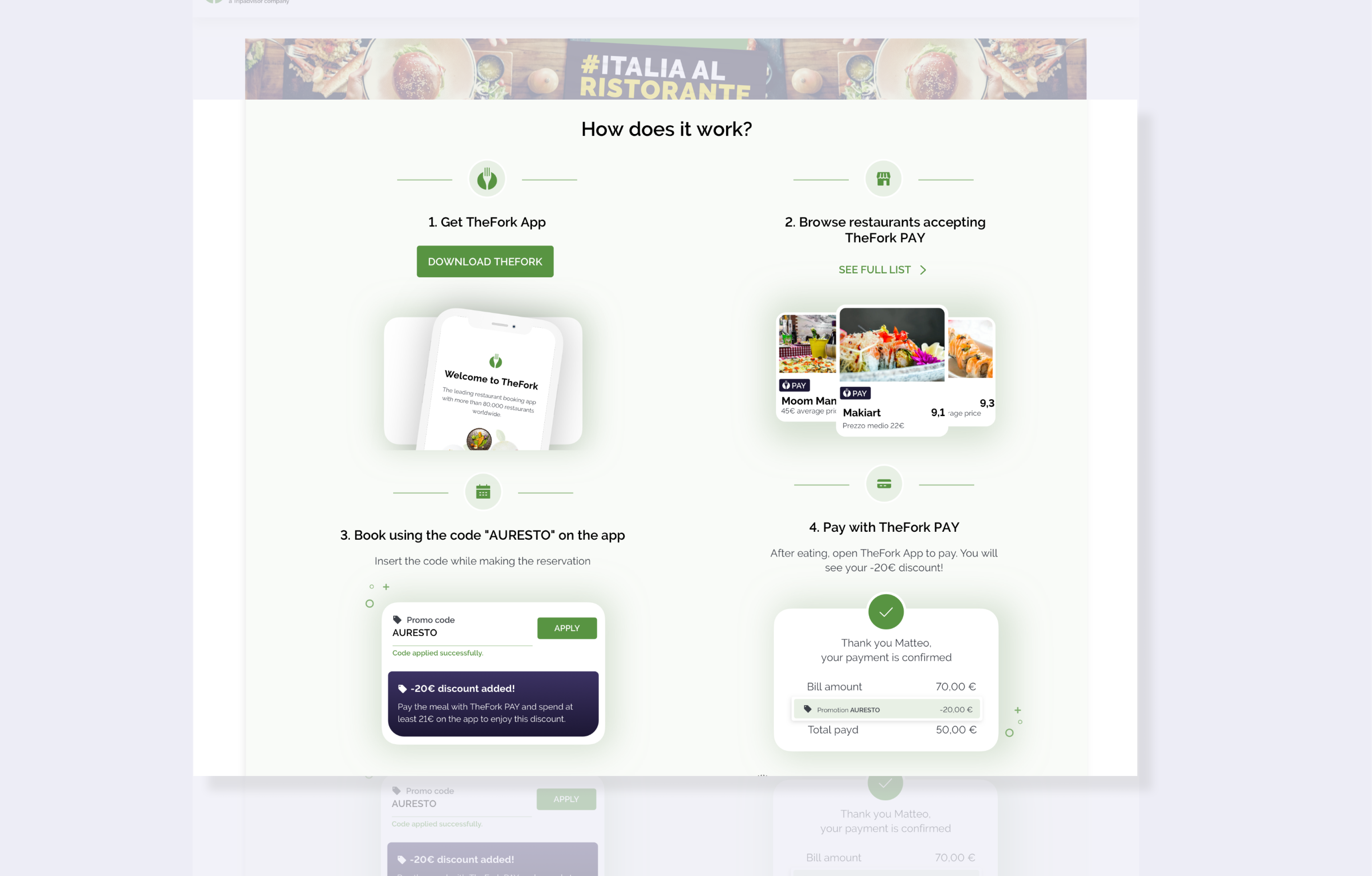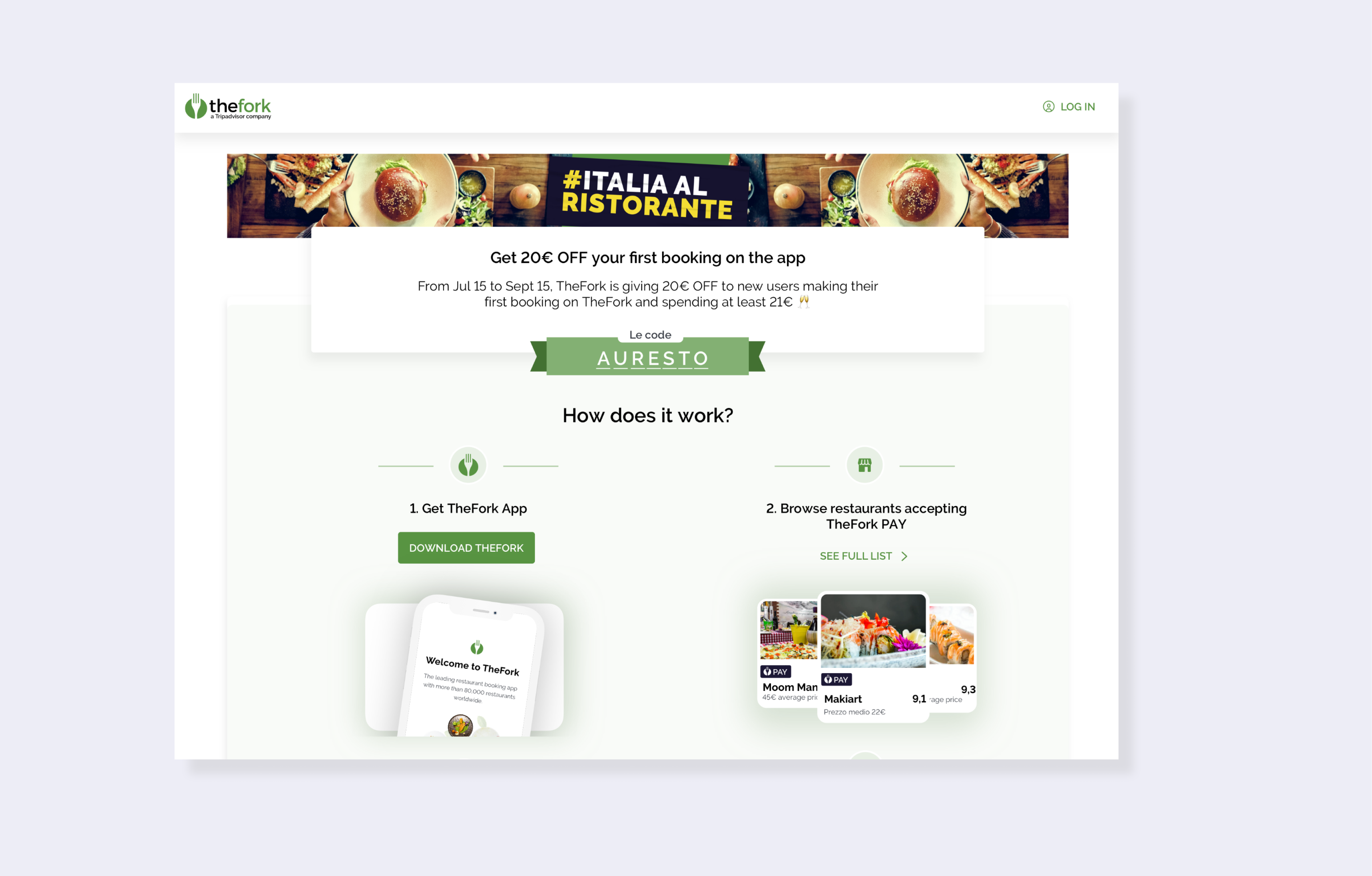 Anyone that has never booked through TheFork platform will be able to benefit from 20€, by entering the “AURESTO” [localize] code in TheFork app on their first booking. TheFork is committed to offering restaurants fit for every occasion and every budget to allow as many people as possible to enjoy gastronomy and share happiness through amazing culinary experiences.